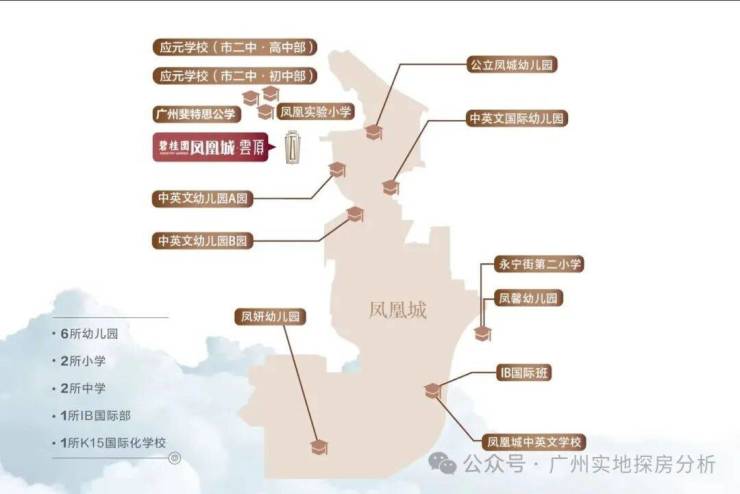 社区配套幼儿园,周边有公办凤凰实验小学,仅100米距离即市二中应元学校(初高中部,2021年高考高优率广州第一)、K15国际化学校广州斐特思公学,目送式上学。