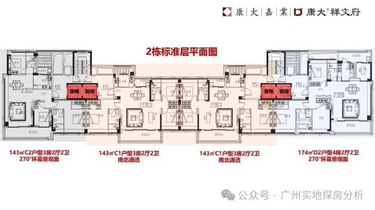 C1户型建面约143㎡三房两厅两卫,约6.6m巨幕景观阳台,一梯一户,私家候梯厅,纯板式设计南北对流,独立主套,多功能客厅。