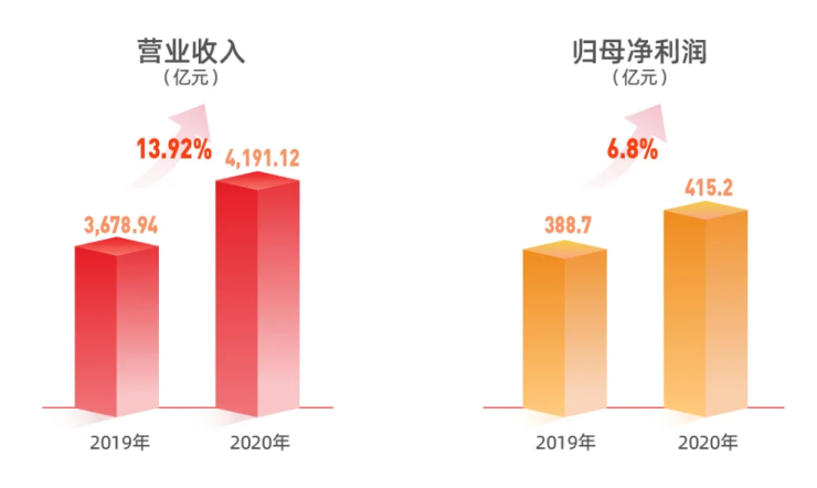 站在管理红利时代的元年往回看,万科交出的入门答卷可谓“质量兼备”。2020年,万科营收4191.1亿元,同比增长13.9%;归属于上市公司股东的净利润415.2亿元,同比增长6.8%;开发业务合同销售额7041.5亿元,同比增长11.6%。