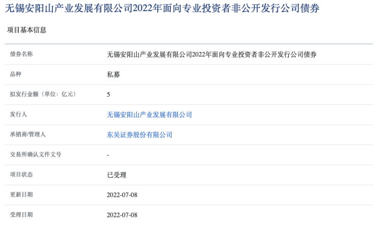 无锡安阳山产发公司5亿元私募债券获上交所受理