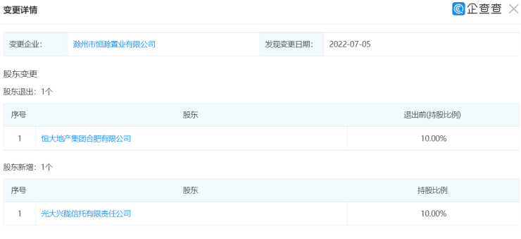 焦点财经讯 耿宸斐 7月6日,企查查显示,恒大地产集团合肥有限公司将在滁州市恒滁置业有限公司10%的股权转让给光大兴陇信托有限责任公司。
