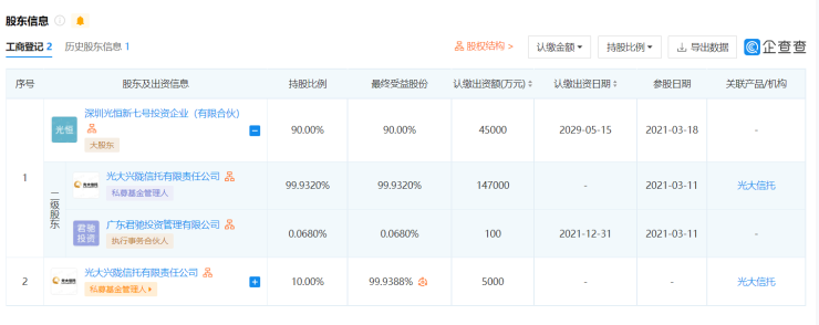 据悉,深圳光恒新七号投资企业(有限合伙)持有滁州市恒滁置业有限公司90%股权,光大兴陇信托有限责任公司持有深圳光恒新七号投资企业(有限合伙)99.9320%股权。
