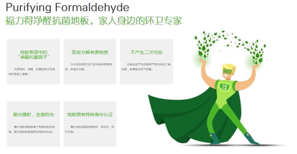 福力得地板针对消费者健康方面也做出了自己的行动。2014年净醛·抗菌地板的出现让福力得在木地板发展的道路上展示了自己的能力:经国家权威机构检测,福力得净醛·抗菌地板对大肠杆菌和金黄葡萄球菌抗菌率高达99.98%、24小时持续净醛率高达85%!