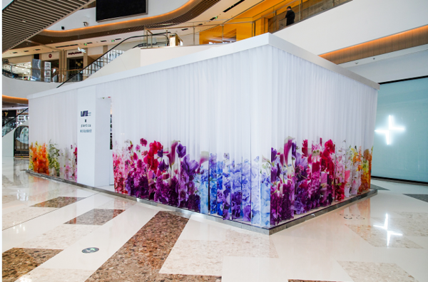 贯穿整个空间的是印花半透明绢布打造的迷宫围墙,穿梭期间,仿佛经历一场美梦。打造这一幻境的则是日本花艺团队plantica。plantica擅长以花卉作为创作素材,通过崭新的创作手法,将近600年历史的华道美学传向全球,综合艺术、流行、设计、表演等多领域。其创始人木村贵史,出生于草月流花道家,长年活跃在巴黎、米兰、柏林、摩纳哥、纽约等世界舞台。他的作品融合传统日本花艺美学与西方插花技巧,让人感受到花艺也能是深入生活的艺术品。在他引领之下,花艺设计团队plantica,透过拆解花朵的手法,重新拼接组合成迷人的图腾,除了花艺既有的立体层次,创造出了平面向度的创作美学,赢得了世界青睐。
