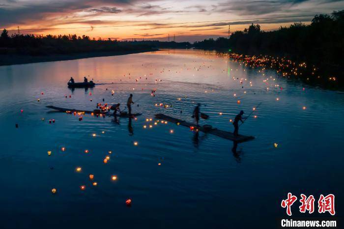 7月2日,在安徽省宣城市宣州区水东古镇,来自全国各地的游客和当地的村民将各式各样的荷灯放入水阳江中。