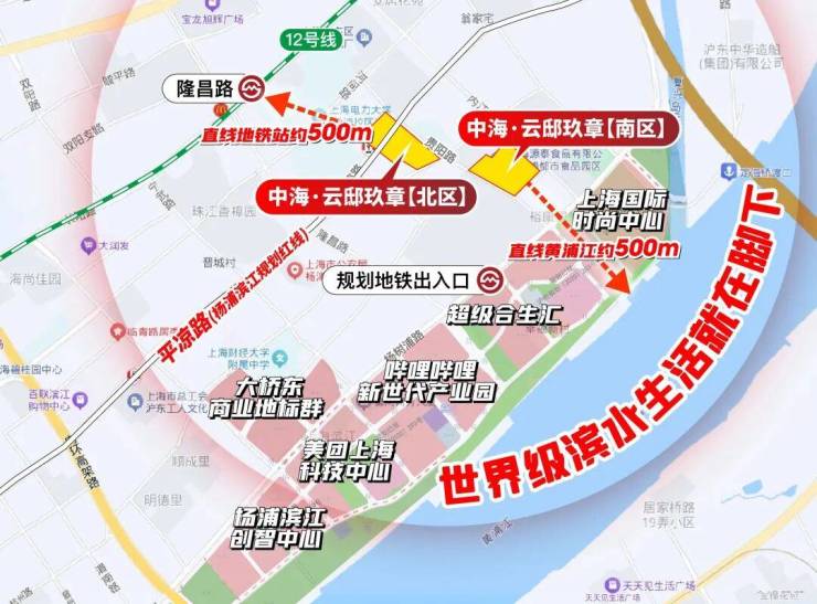 中海·云邸玖章距离江岸直线距离仅约500m,作为当下片区内离江最近的项目,享美团、B站、超级合生汇等地标综合体配套,杨浦滨江生活中心。