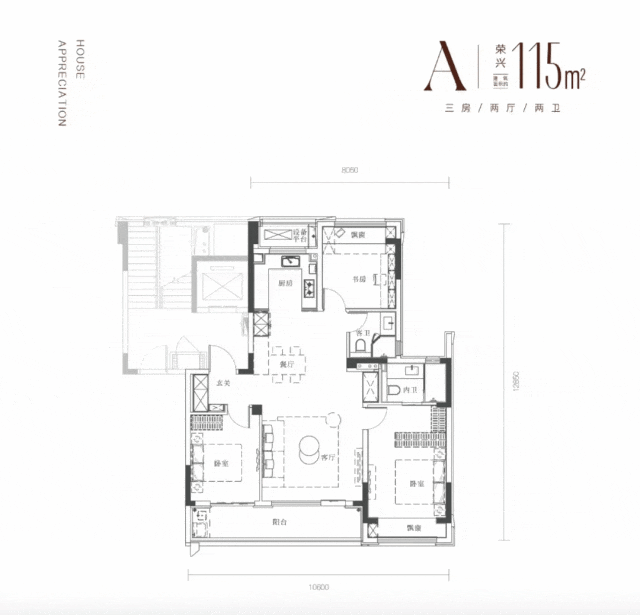 建面约115㎡三房两厅两卫户型,得房率约83%,约7米开间的超大阳台以及独立收纳库配置,造就舒适生活场域。
