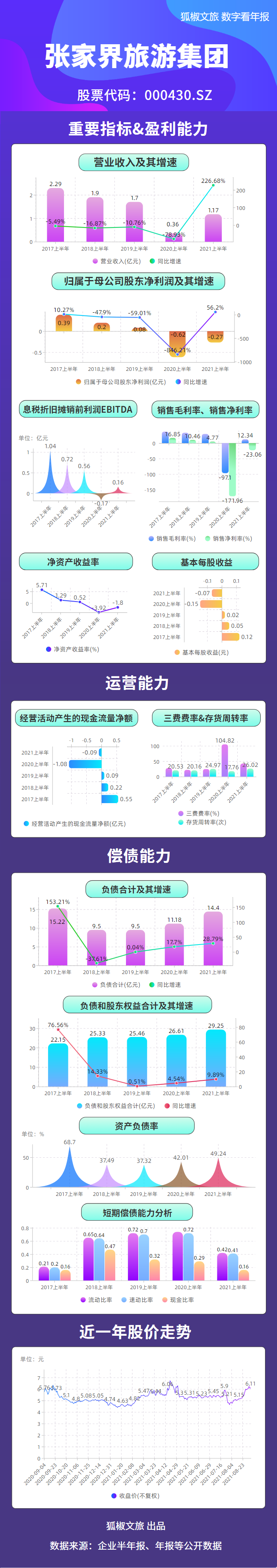 在归属于母公司股东净利润方面,2017年至2019年同期,张家界归属于母公司股东净利润分别为0.39亿元、0.2亿元、0.08亿元、-0.62亿元、-0.27亿元。本报告期内,张家界负债合计为14.4亿元,同比增长28.79%;资产负债率为49.24%;短期偿债能力较弱。