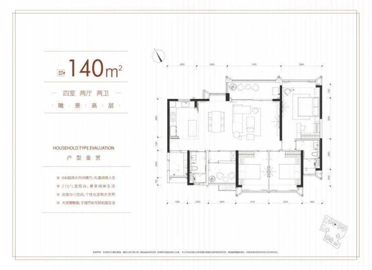 另外还有140㎡的四房户型,采用横厅设计,南北对流,北向主阳台望公园,南向卧室飘窗看小区园林,只是目前剩余房源已经不多,价格也相对更高一些。