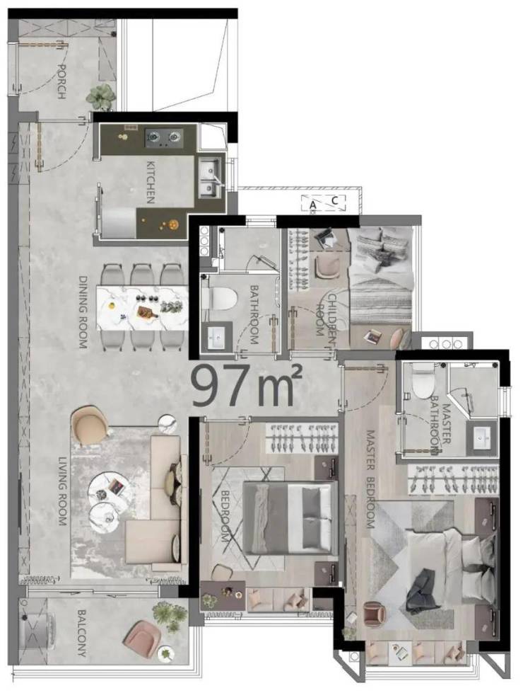 最受刚需家庭关注的是 97㎡的三房两厅两卫,总价约 360-380 万元,单价 3.8 万 / 平起。这个户型带专属入户花园,三开间都朝南,还有一个 N+1 可变空间,主卧搭配超阔观景飘窗,采光和实用性都不错,很适合*置业的小家庭。