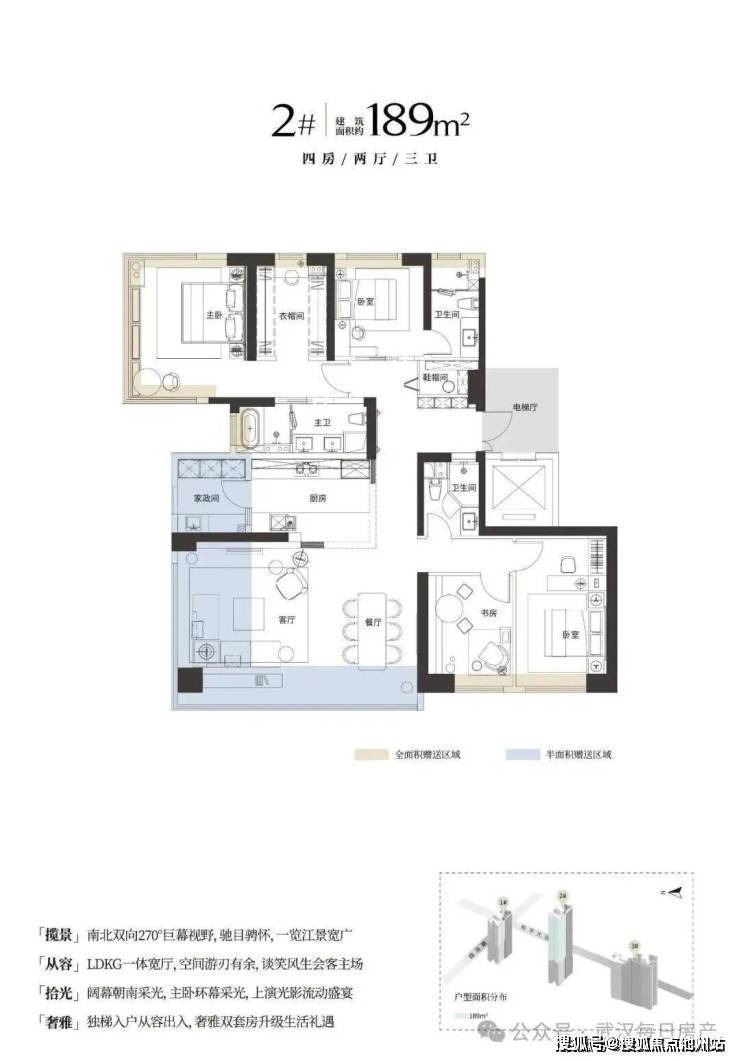 1号、2号楼靠近和平大道一侧为149㎡户型,西侧3-15层为153㎡;16层及以上为189㎡有看江视野;3号楼为146㎡、153㎡和189㎡户型组合。