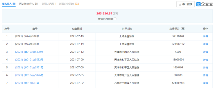 目前,天房集团已有被执行记录58条,被执行总金额365936.97万元。