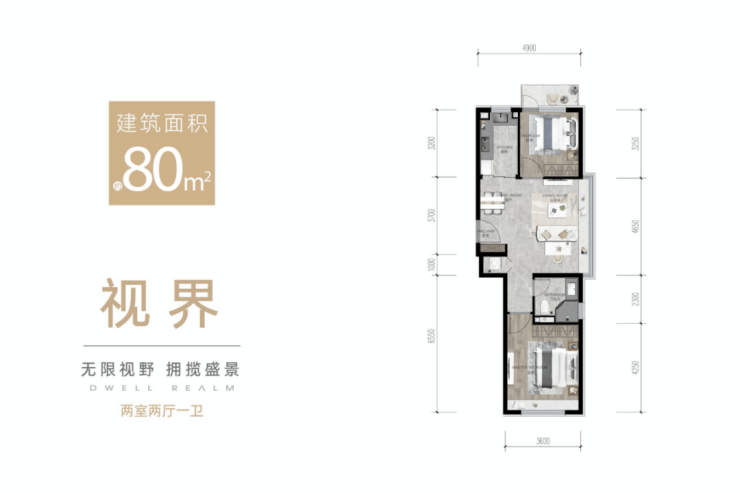 80㎡两室两厅单卫户型,全景宽境的客厅,搭配三面阔景的采光,非常宽敞明亮。