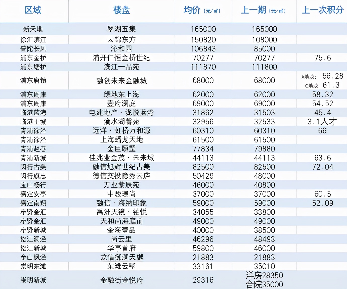 比如,翠湖五集16.5万/㎡、浦开仁恒金桥世纪7.03万/㎡、融创未来金融城6.8万/㎡、上海蟠龙天地云庭6.15万/㎡、中骏璟尚3.7万/㎡等。