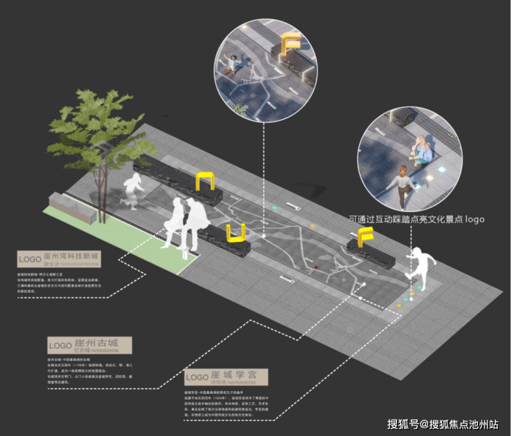 热带植被环绕的林下空间里,是一幅嵌刻在地面的《千年古城-科技新城时间轴版图》,它以时间轴地图的形式描绘了崖州古城到新城的发展历史——公元 1044 年的崖城学宫为起始,到崖城古城、黄道婆黎族棉织地水南村,直至现如今的汀澜和著所处的崖州科技城。立于版图的一侧的是对于这段历史中人物、建筑、文化的简介。