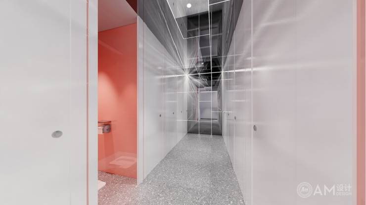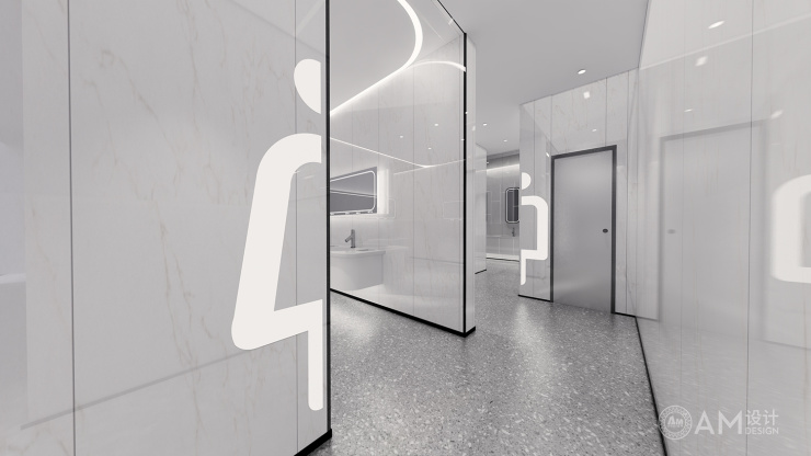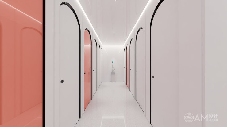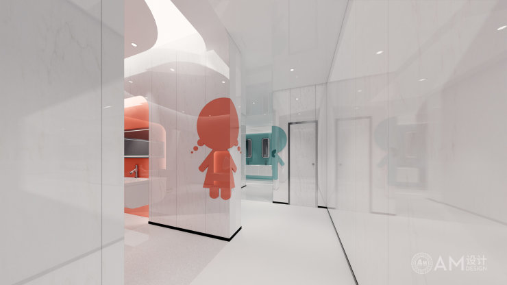 每个厕门都仿佛是打开童话世界的大门,卫生间的尽头一个小动物向你招手,仿佛在想和你交朋友。灯光线条和材质的结合让整个空间干净且童趣。