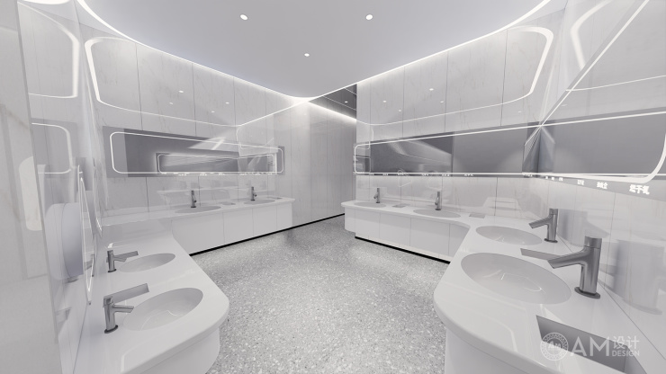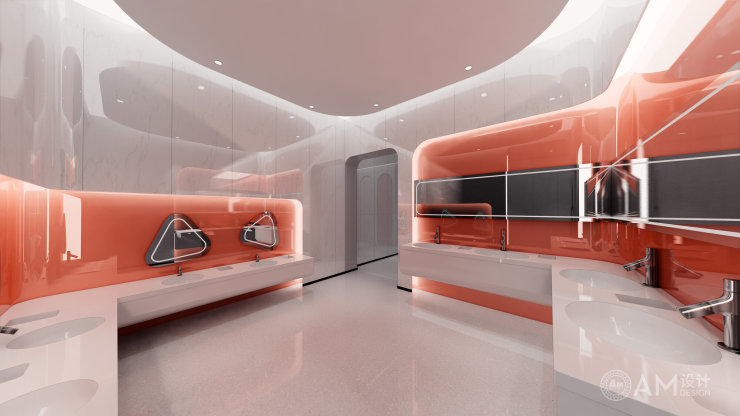 女卫生间整体时尚又不缺少儿童的趣味,温暖趣味的色块,趣味的儿童镜子,灯光呈现的线条感,不同于普通的卫生间,儿童洗手盆的数量与成人洗手盆的数量一样,这是一个儿童大人同等的空间。