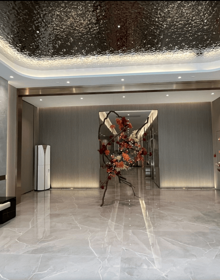 入户大堂做了挑高,顶部做了blingbling的弧形顶面。三面墙体都做了腰线装饰,用金属材料包边,增强了品质。大堂有陈设艺术装置和绿植,现代格调。