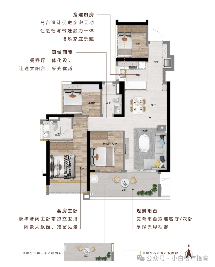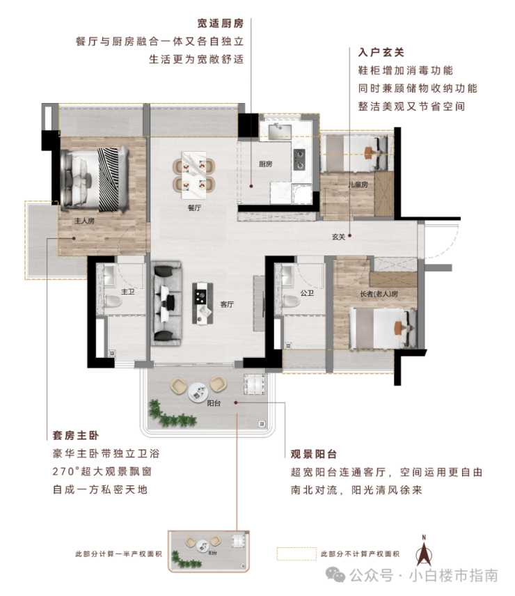 南北通透|主卧 270°飘窗+双飘窗|U 型厨房|南向观江景阳台