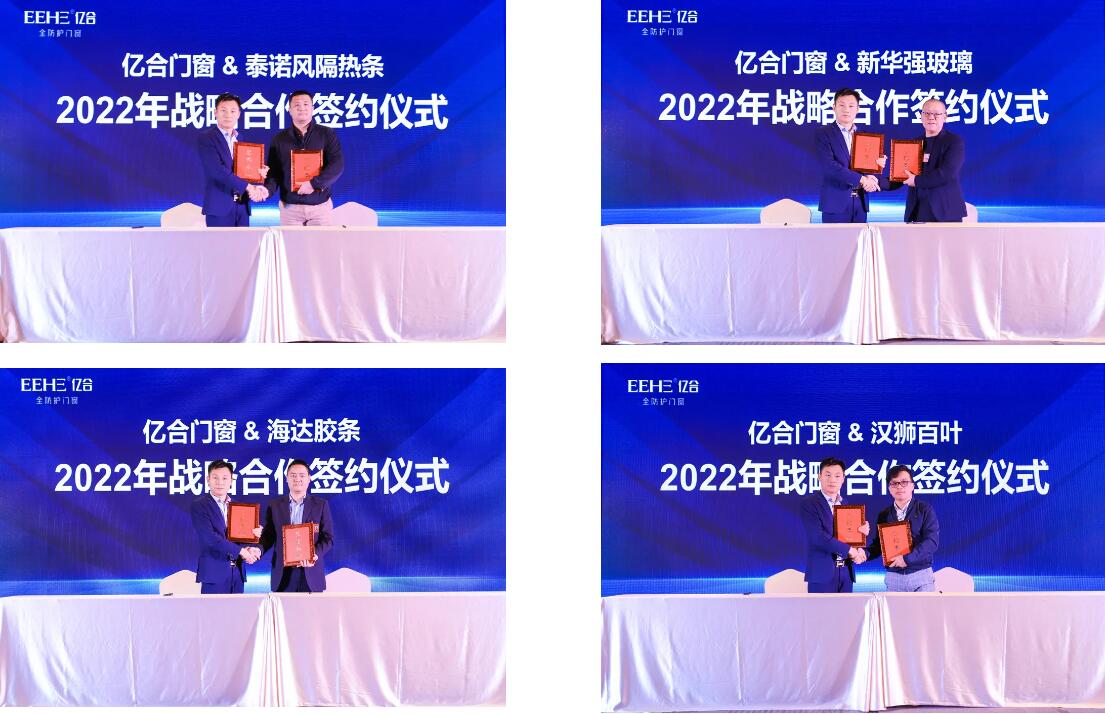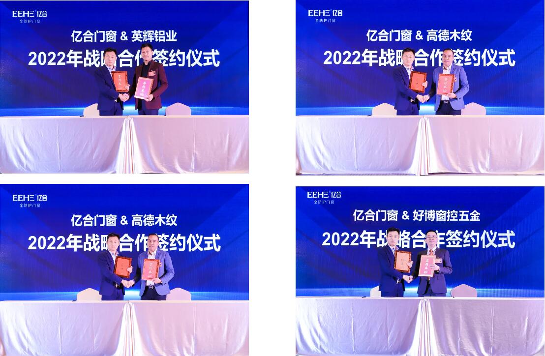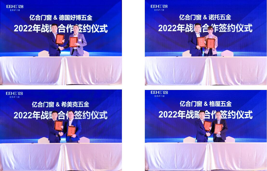 本次大会上,公司总经理胡超亲自同英辉铝业、中联铝业、高德木纹、德国好博五金、德国诺托五金、德国格屋五金、泰诺风隔热条、海达胶条、希美克五金、好博窗控、新华强玻璃、汉狮百叶等12家供应商签订了2022年战略合作协议。