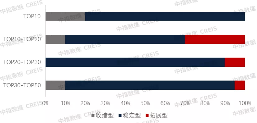 根据近两年房企公布的发展战略、多元业务经营计划及现状,中指研究院将50家典型房企分为三类:收缩型,稳定型与拓展型。其中,收缩型房企更多地聚焦主业,未提及新的多元化发展方向,放弃部分已有的多元业务;稳定型房企发展战略与往年保持基本一致,多元业务方向基本相同,在既有赛道持续投入与发展;拓展型房企提出新的多元发展战略,独立出多元业务部门,或者尝试新的多元发展方向、布局新的业务领域。