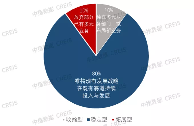 不同层级房企的多元化发展情况存在区别。将50家典型房企按营业收入分为四个层级,TOP10房企中80%为稳定型,没有房企提出新的多元化发展方向,但是有两家企业对业务进行了缩减;TOP10-20的企业有30%为拓展型,占比在四个层级中较高;在其余房企中,绝大部分选择保持既定多元发展方向,只有少数企业开辟新业务领域、或者放弃已有的多元业务。