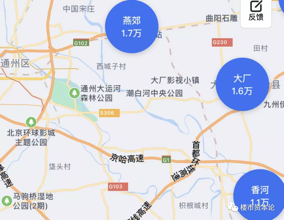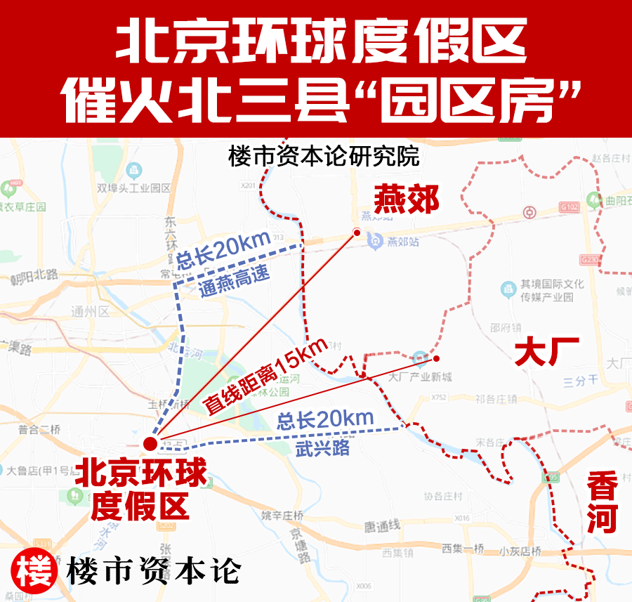 (楼市资本论北京环球度假区“园区房”定义:以北京环球度假区为圆心,15公里为半径画圆,与北三县重合的区域;以及通燕高速、武兴路在北三县境内两侧距离度假区实际驾车距离20公里以内的区域。)