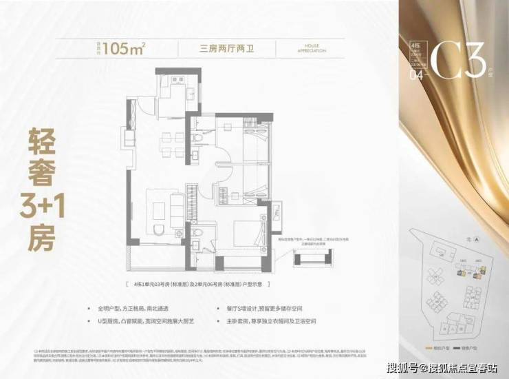 105平3房2厅2卫。