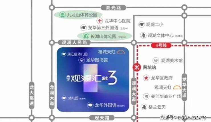 4号线地铁上盖物业。观澜汇紧邻观澜大道西侧,整体沿大道南北纵向布局。三期位于大项目的南面,规划的商MALL和地铁4号线茜坑站直连。