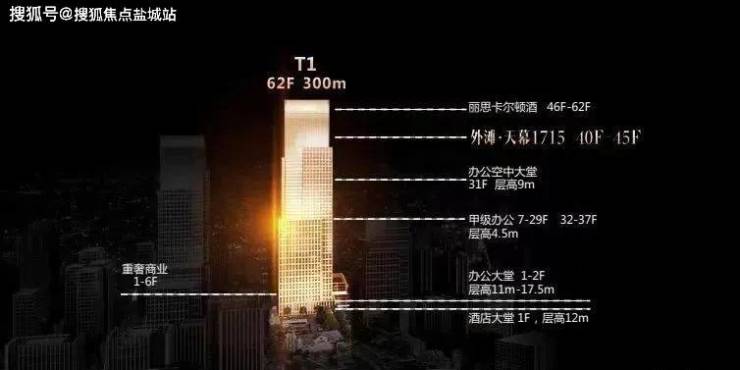 T1 -300米超高层塔楼上部46-62层为五星级酒店(丽思卡尔顿)、38,40-45层行政公馆,中部7-37层为甲级办公,底部为商业及大堂。