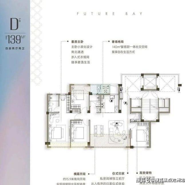 约139方户型,4.5开间朝南+储藏间,南向15.9米超大采光面,做到五开间朝南的空间,标配储藏间,三个南向卧室设计。