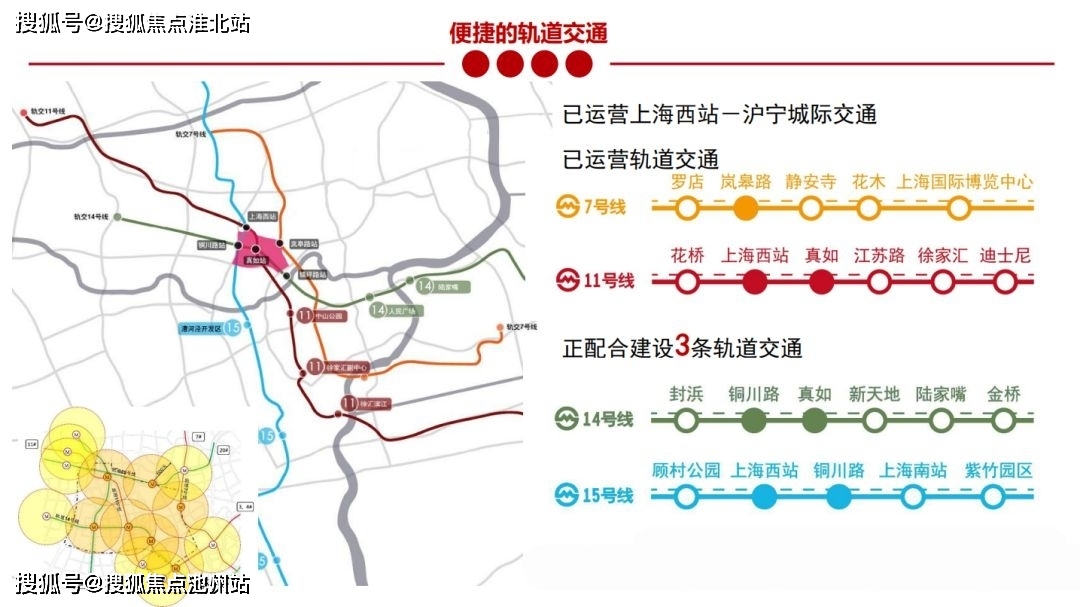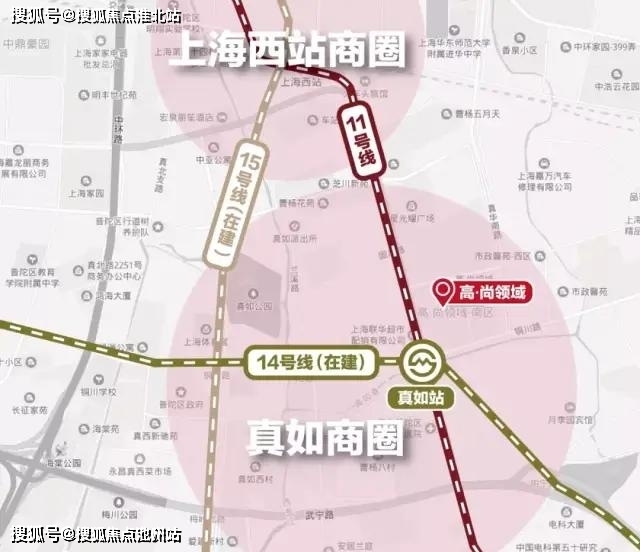 真如站:11和14号线相交,真如副中心核心上海西站:15和11号线相交,真如副中心北翼铜川路站:14和15号线相交,普陀区政府所在地