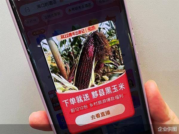 近日,不少消费者反馈,双12期间在飞猪官方直播间下单安徽黟县的旅游商品,被随单赠送了一份当地特产黑玉米。“元旦想带着孩子去宏村,就囤了一个包含门票和酒店的套餐,没想到还送特产。”来自杭州的陈女士称,物流订单显示她的黑玉米已经发货。