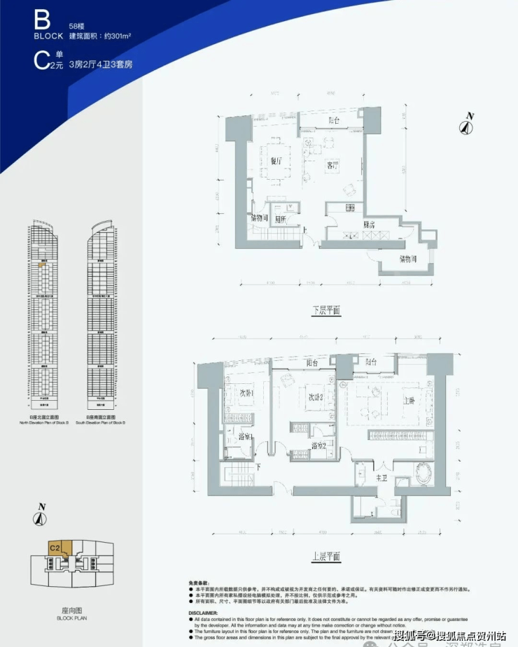 B座58层C2单元,建面约301㎡,3房2厅4卫3套房