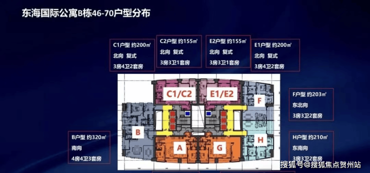 东海国际公寓建面约19万㎡,A、B两栋,户型涵盖75m²一房至800m²顶复,主力户型为140-500m²,户型面积跨度很大大,有30多个户型。目前在售主力户型为77/122/320/365㎡。