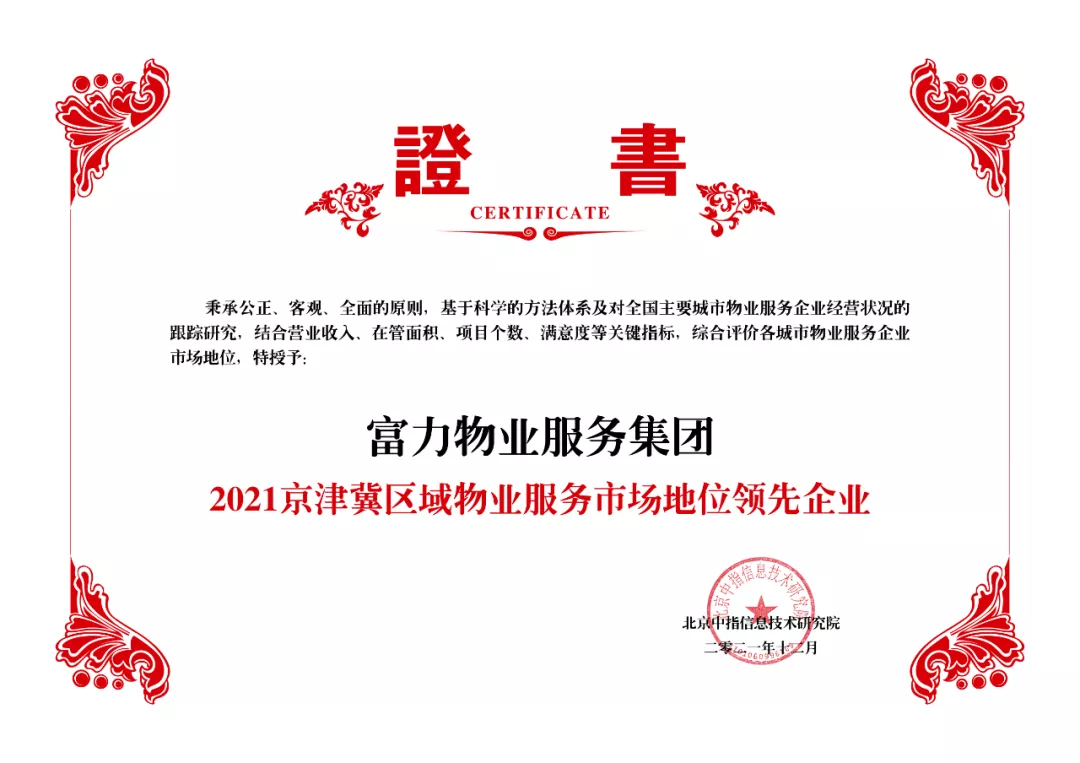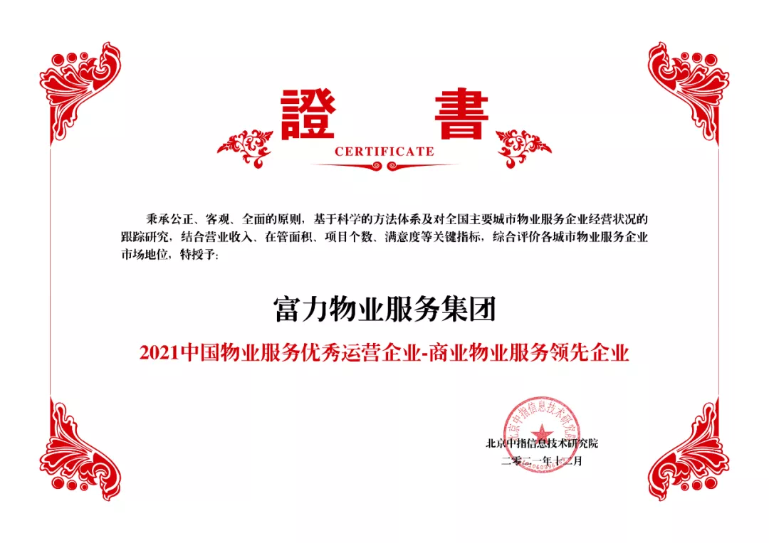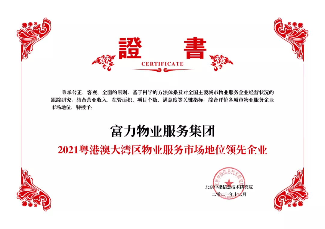 2021年12月2日,由北京中指信息技术研究院主办的“2021中国房地产大数据年会暨2022中国房地产市场趋势报告会”于北京隆重举行。深耕品质的富力物业凭借先进的服务力赢得了业户与同行的认可,荣获“粤港澳大湾区物业服务市场地位先进企业”等多个奖项。