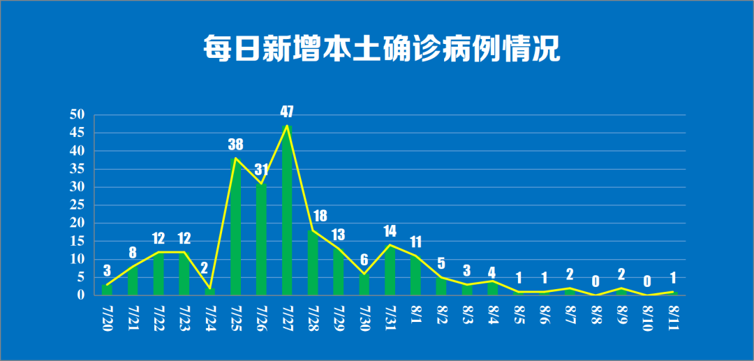 根据省卫健委8月12日发布,2021年8月11日0-24时,我市新增新型冠状病毒肺炎本土确诊病例1例,普通型,无新增无症状感染者。新增出院病例2例。