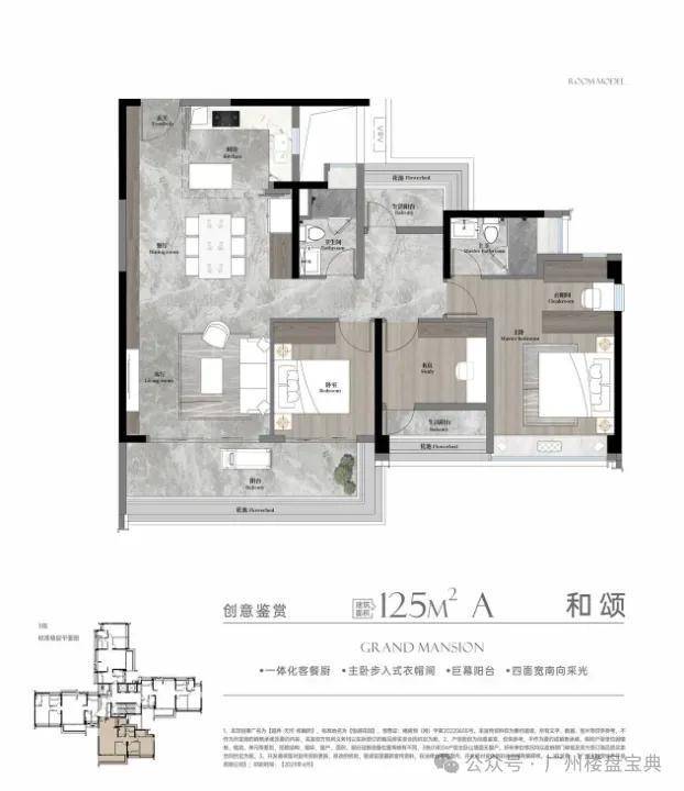建面125平四房,LDKG一体化设计,L型独立岛台中西厨房,7米南向采光景观阳台,可改成四房两卫,步入式衣帽间。