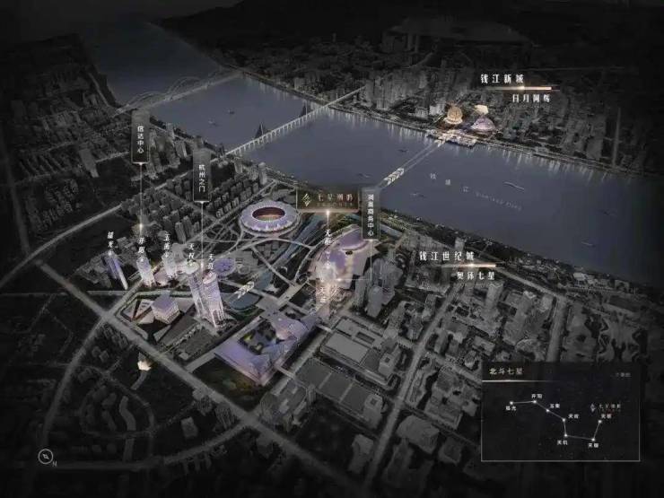 其建筑排布模拟北斗七星格局,楼顶透明星光厅夜间点亮时宛如星空,与钱塘江潮景形成的意象,象征城市活力与自然的和谐共生13。