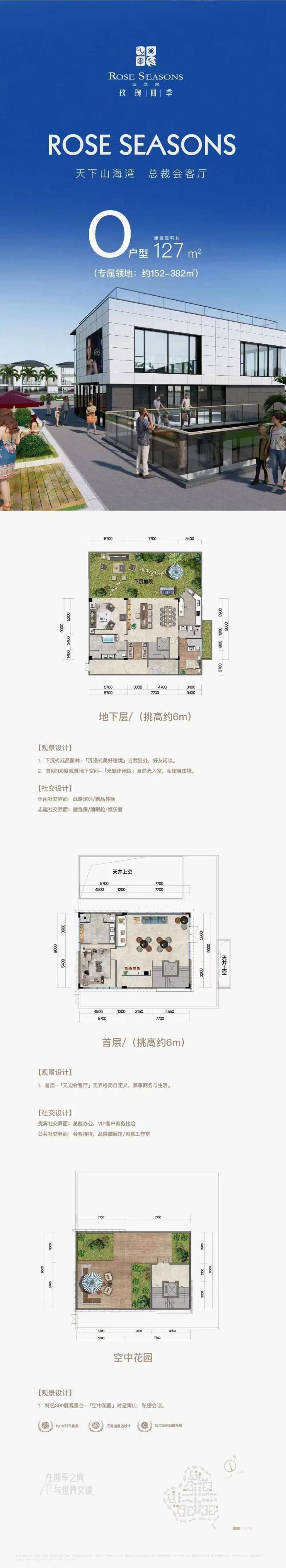 【五大创新设计 只为峯层定制】1. 约6米轩昂挑高,容得下您收藏的瑰丽之作2. 整体无遮挡通透设计,四位空间自由拓展无限可能3. 特色270度观景台,一面瞭望三山一谷,一面尽揽繁华商街4. 在可容10000朵玫瑰的宏大独立花园,饮茶晤面漫谈商场风云5. 首创180度观景地下空间,惬享下沉式成品园林
