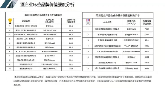 舒达荣居中国饭店业床垫品牌价值排行榜排名前列名
