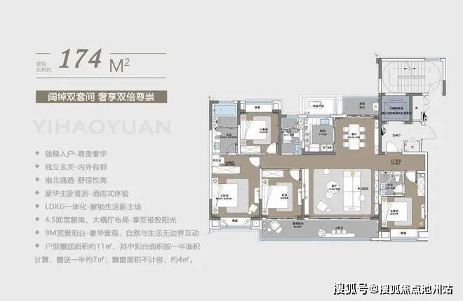 独梯入户-尊贵奢华;独立玄关-内外有别;南北通透-舒适性 高;豪华主卧套房-酒店式体验;LDKG一体化-解锁生活新主场;4.5面宽朝南,大横厅布局-享受极致阳光;9M宽景阳台-奢华景观,自然与生活无边界互动;户型赠送面积约11㎡,其中阳台面积按一半面积计算,赠送一半约7㎡;飘窗面积不计容,约4㎡。
