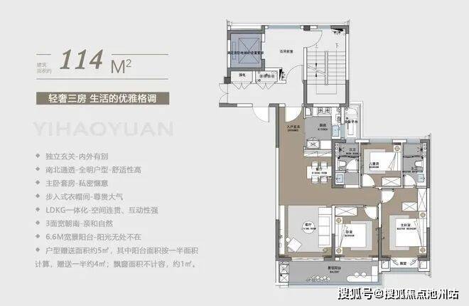 独梯入户尊贵奢华;独立玄关内外有别;南北通透,全明星户型-舒适性高;主卧套房私密惬意;LDKG一体化-空间连贯、互动性强;3面宽朝南-亲和自然;6.8M宽景阳台-阳光无处不在;户型赠送面积约5.5㎡,其中阳台面积按一半面积计算,赠送一半约4㎡;飘窗面积不计容,约1.5㎡。