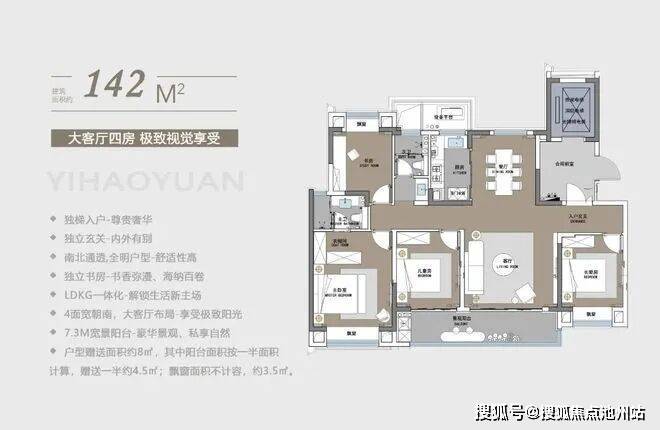 独梯入户-尊贵奢华;独立玄关-内外有别;南北通透,全明星户型-舒适性高;独立书房-书香弥漫、海纳百卷;LDKG一体化-解锁生活新主场;4面宽朝南,大客厅布局-享受极致阳光;7.3M宽景阳台-豪华景观,私享自然;户型赠送面积约8㎡,其中阳台面积按一半面积计算,赠送一半约4.5㎡;飘窗面积不计容,约3.5㎡。