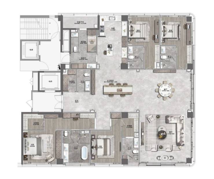 几近绝版的一梯一户,保姆梯直通家政间和厨房,餐客厅面积达到了109m²,远超普通大平层的70m²,层高4m净高3.4m,远超普通的3m。4个套房+保姆间的设计,每个人都有自己的独立空间,互不打扰。餐厅两个隐藏门进去,男孩房活泼有趣,女孩房文静甜蜜,10楼以上还能看得到钱塘江。