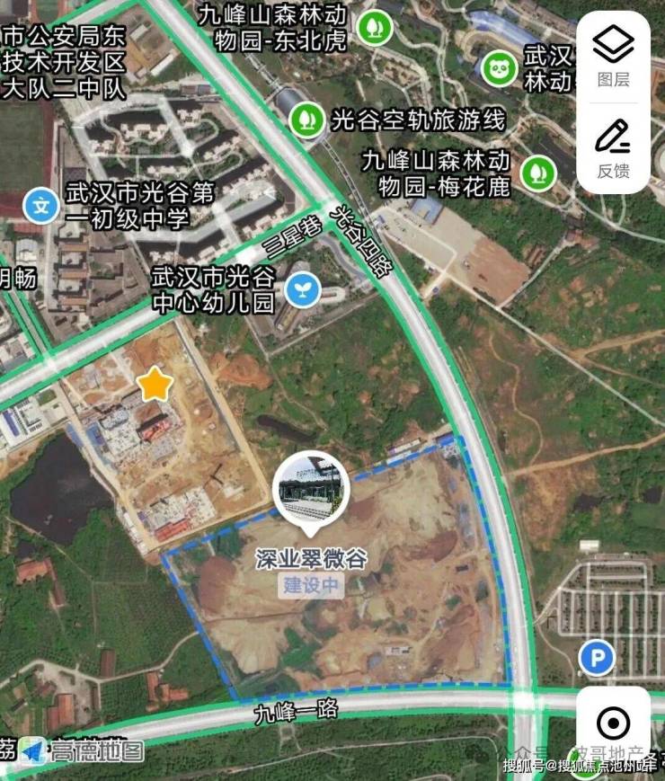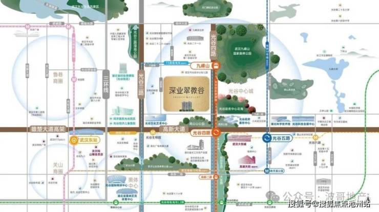 项目四至:北侧中建壹品汉韵公馆、三星巷、武汉市光谷第一初级中学;南侧九峰一路、鸡公山公园、西苑公园等;西侧为孟新路、生物创新园、等;东侧光谷四路。