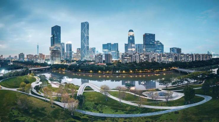 海珠区本就是珠江中的一个大岛,域内河流纵横蜿蜒,设计借助浑然天成的自然水系,建立水绿互通的系统。