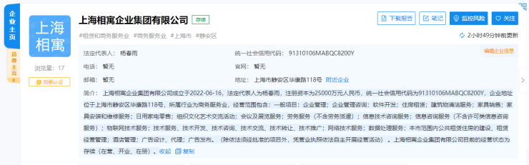 上海相寓企业集团有限公司成立于2022年6月16日,法定代表人为杨春雨,注册资本为2.5亿元人民币,经营范围包括企业管理;企业管理咨询;软件开发;住房租赁;建筑物清洁服务;家具销售等。