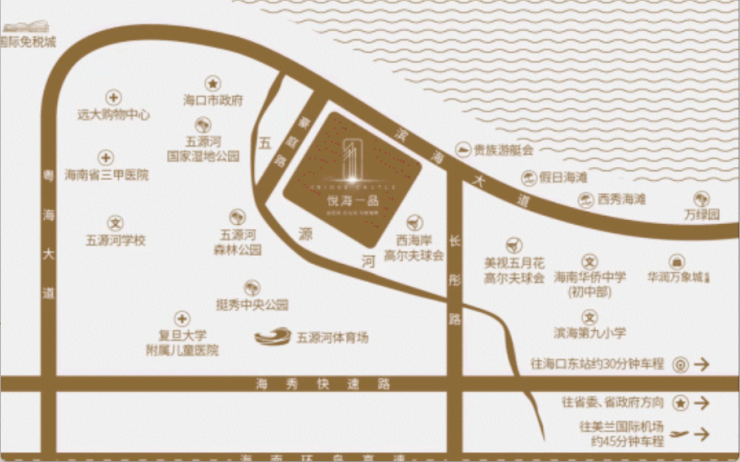 近享海口国际免税城、3大城市公园、2大高尔夫球会、游艇会、五源河文体中心、国家帆船教育基地、五星级酒店群、国际会展中心、三甲医院、远大购物广场、环球100主题乐园等优质配套