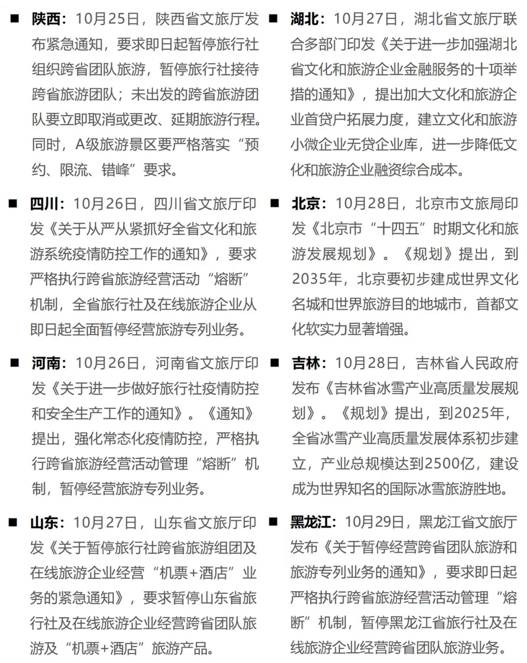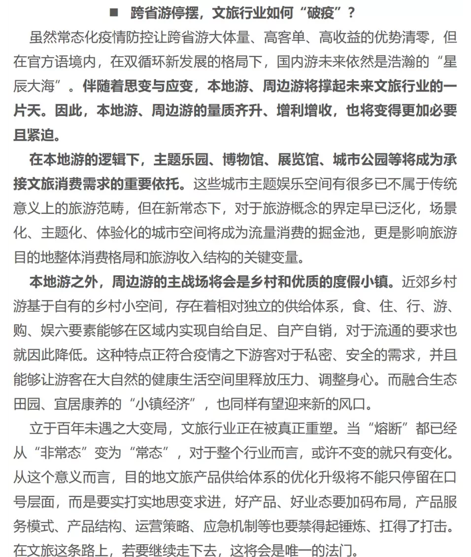 本周,本轮新冠疫情的影响再度升级,包括北京、四川、陕西在内的多个省份针对跨省游启动“熔断”机制,要求暂停全省旅行社及在线旅游企业经营跨省团队旅游及“机票+酒店”旅游产品。熔断机制的密集实行,意味着文旅行业将很难在疫情防控“从严”“从紧”的大环境下泰然处之,未来想必将面临更加困难的生存境地。但另一方面,这也将倒逼旅游目的地、旅游企业的深度转型。